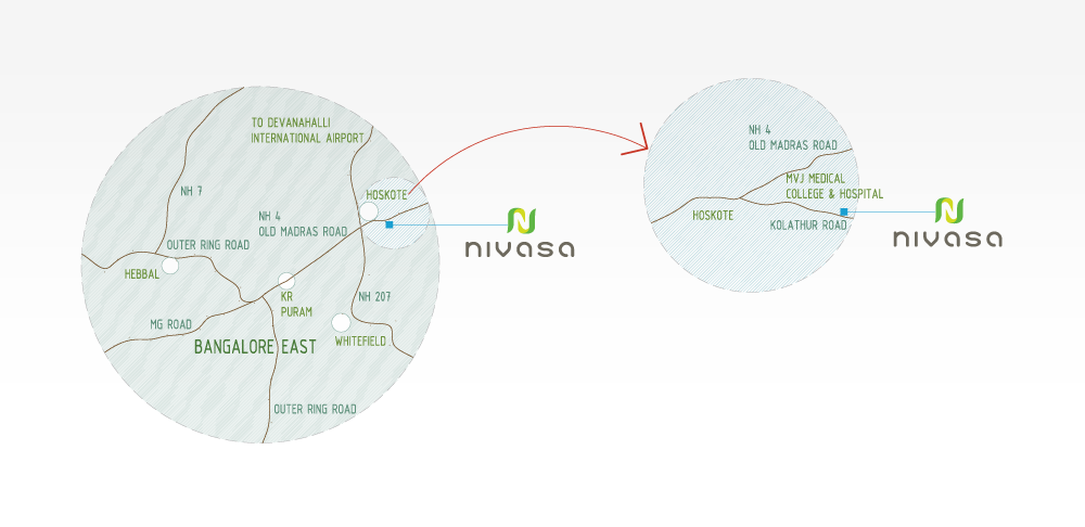 Located at the eastern edge of Hoskote, Nivasa is just a kilometer from the National Highway 4 that connects Bangalore to Chennai. A twenty minute drive along the six lane highway brings you to the bustling suburb of K.R. Puram and on to the Metro Station at Byapanahalli.