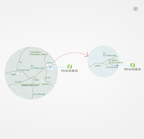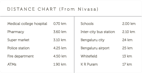 Located at the eastern edge of Hoskote, Nivasa is just a kilometer from the National Highway 4 that connects Bangalore to Chennai. A twenty minute drive along the six lane highway brings you to the bustling suburb of K.R. Puram and on to the Metro Station at Byapanahalli.